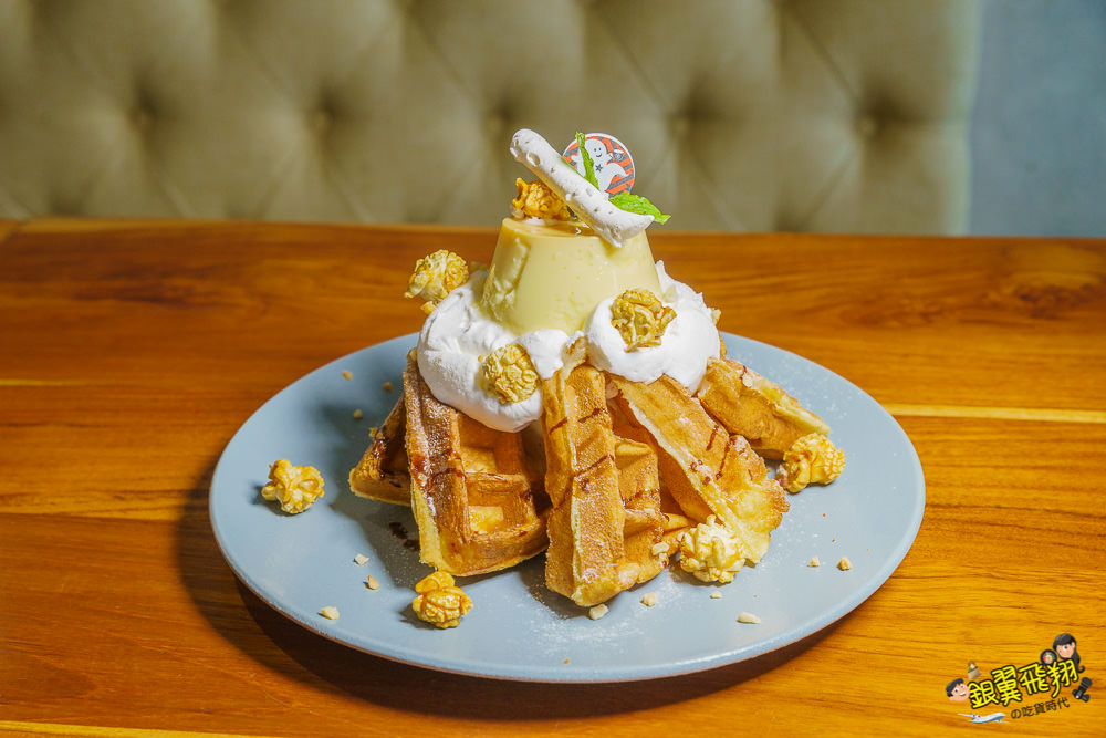麻糬鬆餅一直都是黑浮咖啡的招牌甜點,本次將爆米花、慕斯還有布丁進行結合,不只是吸睛更是美味,首先要提到的就是鬆餅相當軟綿香醇,鬆餅內餡還加入相當軟Q的麻糬增添口感,可以搭配慕斯與香草冰淇淋一起享用,層次口感瞬間跳上兩級。