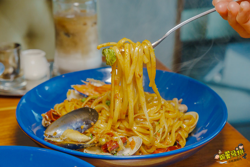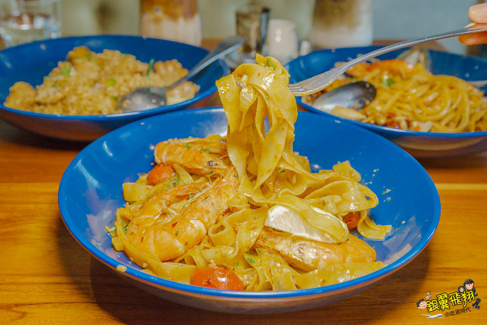 相當新鮮豐富的海味,有蛤蜊、大蝦、小章魚及淡菜,再佐以鯷魚酸豆與新鮮蕃茄燉炒,細扁麵吸附鹹香酸辣多層口感相當誘人美味,喜愛海味的您真的不能錯過。