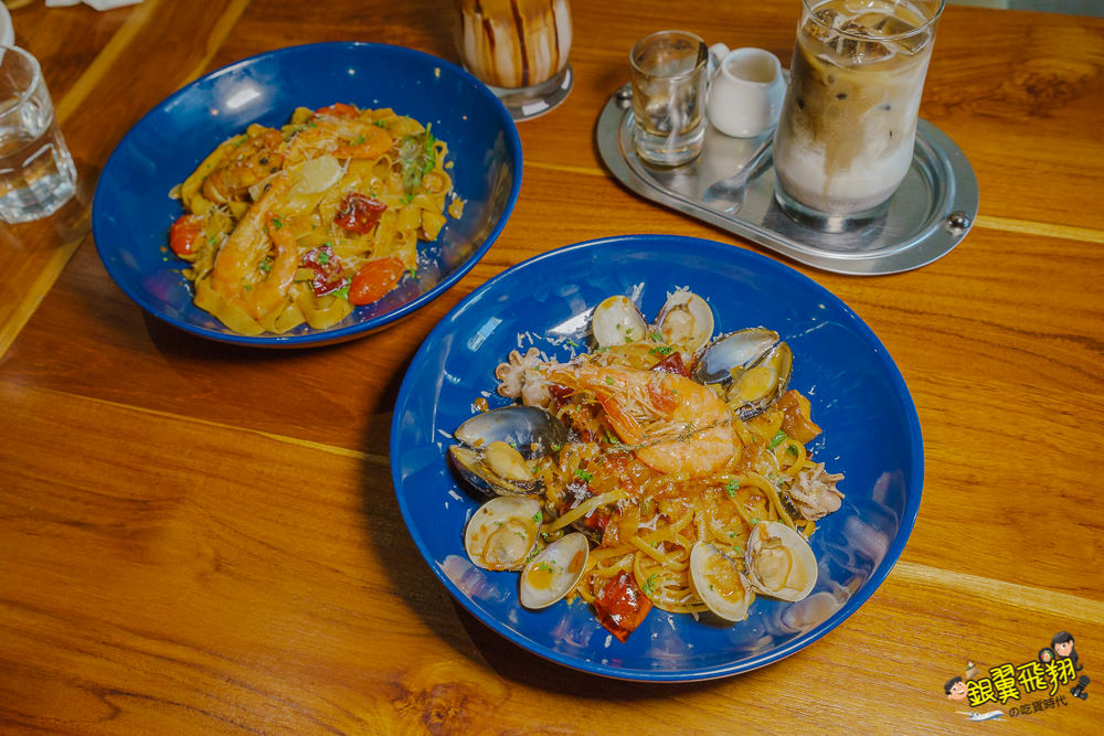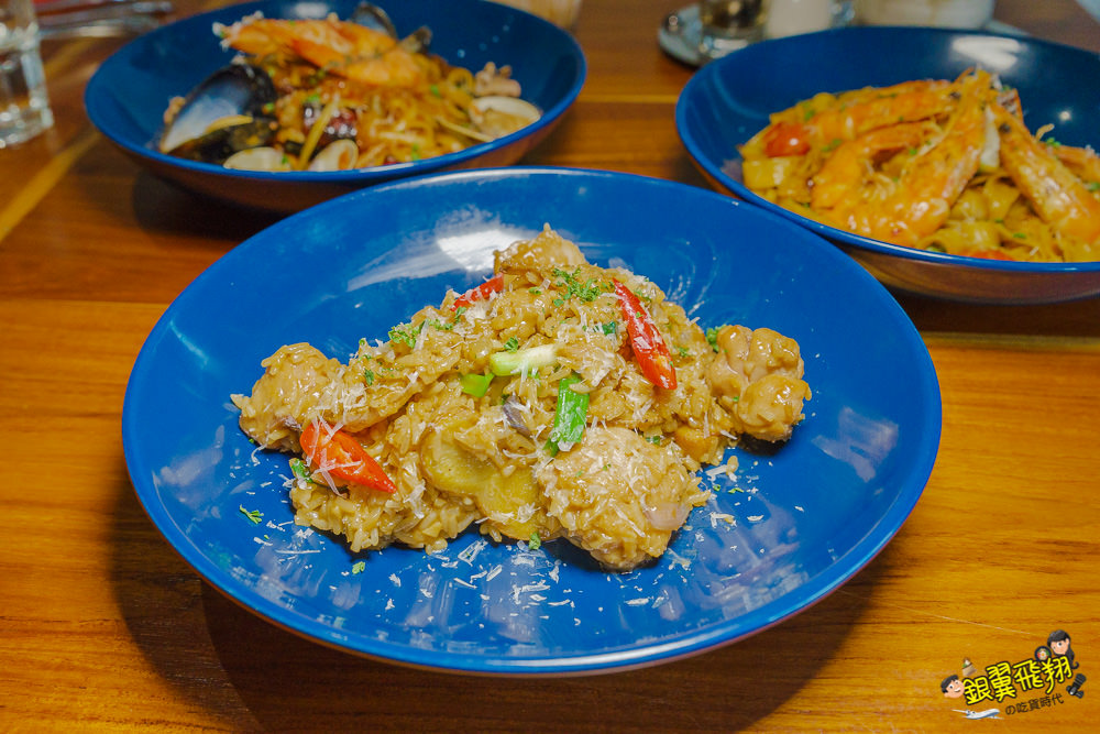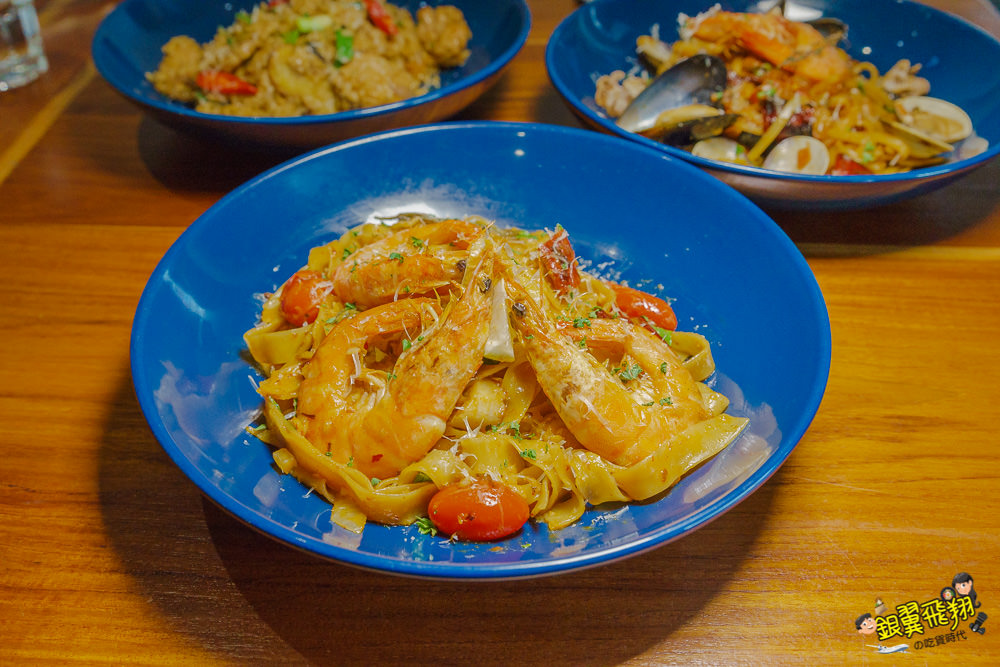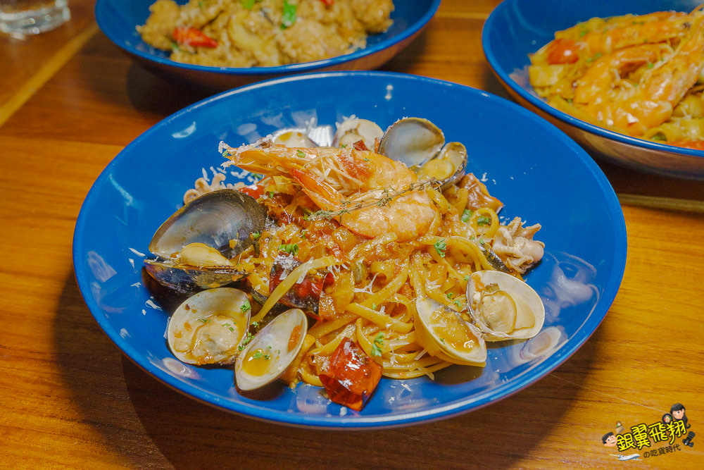蒜香白酒蛤蜊細扁麵、泰式紅咖哩大蝦鳥巢麵、煙花女海鮮細扁麵、白酒番茄義式海鮮燉飯、加利西亞綜合海鮮烤飯。